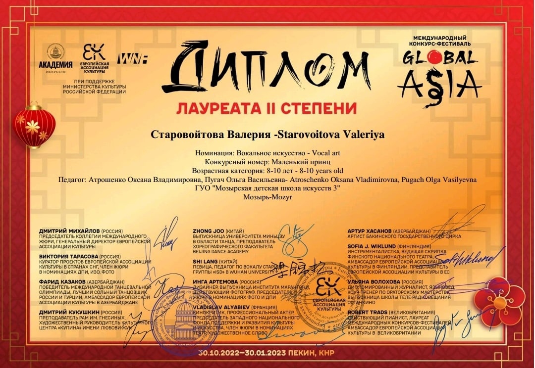 Поздравляем СТАРОВОЙТОВУ ВАЛЕРИЮ с ДИПЛОМОМ в международном конкурсе -фестиваль GLOBAL ASLA учитель: Атрощенко Оксана Владимировна , Пугач Ольга Васильевна Также Атрощенко Оксана Владимировна и Пугач Ольга Васильевна награждены благодарственным письмом