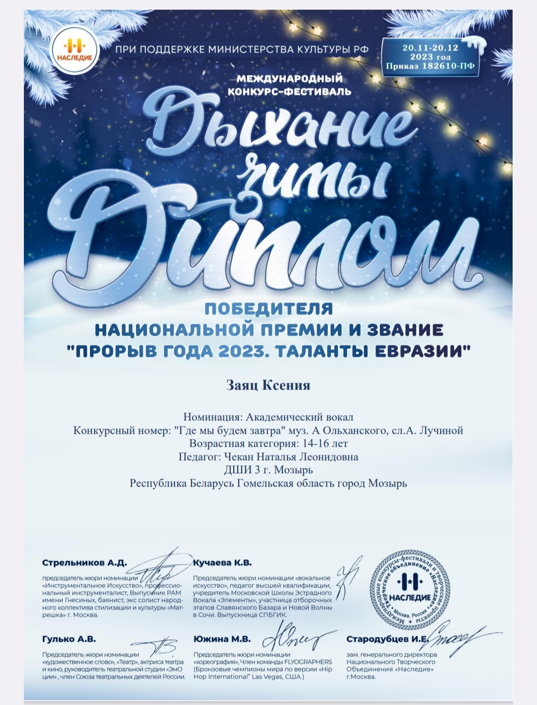 ДИПЛОМ Победителя национальной премии и звание «Прорыв года 2023.Талантв Евразии»