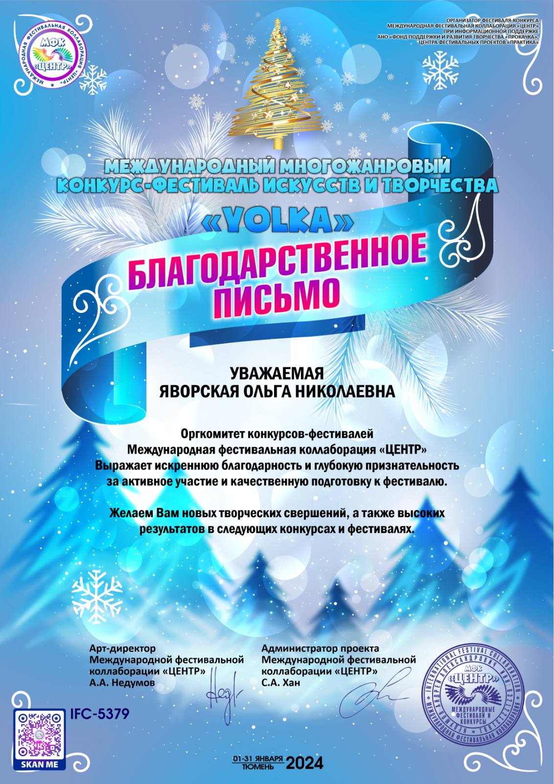 БЛАГОДАРСТВЕННОЕ ПИСЬМО ЯВОРСКАЯ Ольга Николаевна