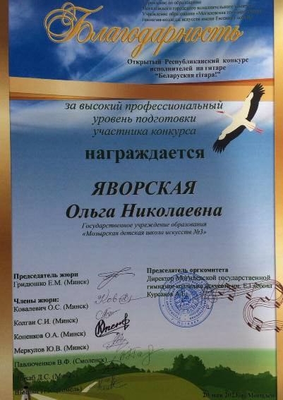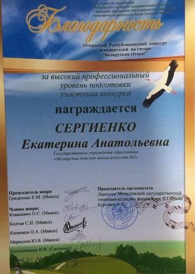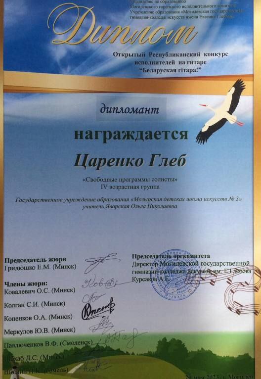 ОТКРЫТЫЙ РЕСПУБЛИКАНСКИЙ КОНКУРС ИСПОЛНИТЕЛЕЙ НА ГИТАРЕ «БЕЛАРУСКАЯ ГІТАРА» ДИПЛОМ Царенко Глеб учитель:ЯВОРСКАЯ Ольга Николаевна БЛАГОДАРНОСТЬ за высокий профессиональный уровень подготовки участника к конкурсу ЯВОРСКАЯ Ольга Николаевна ДИПЛОМ Барсуков Владислав учитель:СЕРГИЕНКО Екатерина Анатольевна БЛАГОДАРНОСТЬ за высокий профессиональный уровень подготовки участника к конкурсу СЕРГИЕНКО Екатерина Анатольевна ПОЗДРАВЛЯЕМ ✨