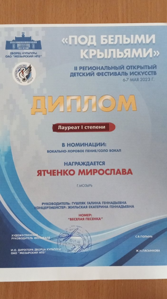 06.05.2023 учащаяся хорового отделения отделения руководитель:ГУШЛЯК Галина Геннадьевна концертмейстер: ЖИЛЬСКАЯ Екатерина Геннадьевна приняла участие во II региональном открытом детском фестивале искусств «Под белыми крыльями» ЯТЧЕНКО Мирослава — диплом ЛАУРЕАТ I степени Также ЯТЧЕНКО Мирослава получила специальный приз от Епархии✨ ПОЗДРАВЛЯЕМ