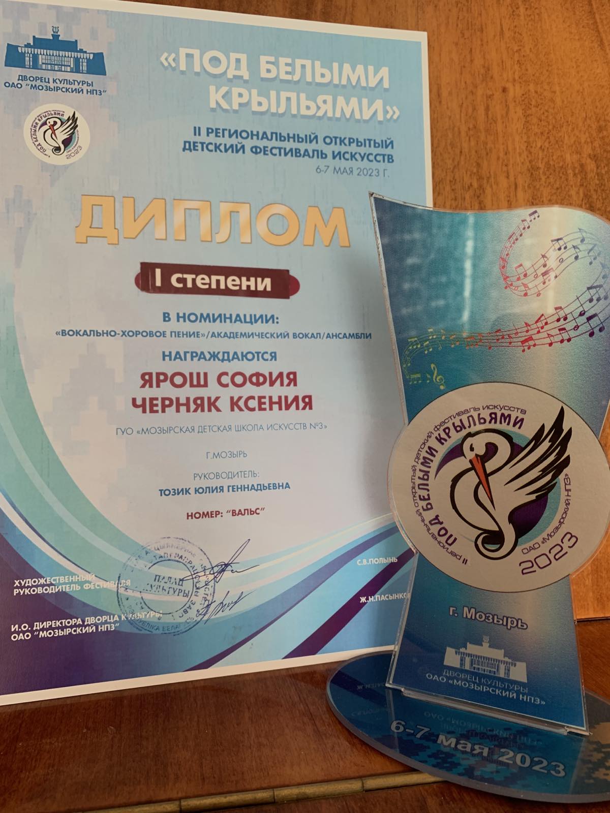 06.05.2023 учащиеся хорового отделения отделения руководитель:ТОЗИК Юлия Геннадьевна приняли участие во II региональном открытом детском фестивале искусств «Под белыми крыльями» ЯРОШ София и ЧЕРНЯК Ксения -ДИПЛОМ I степени ПОЗДРАВЛЯЕМ