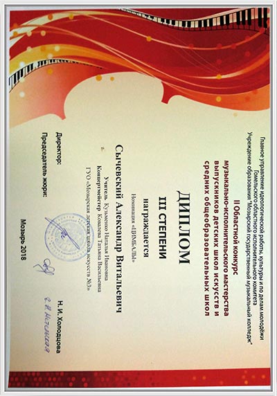 Сычевский Александр (номинация «Цимбалы») – диплом III степени, учитель Кузьменко Н.И., концертмейстер Ковалева Т.В.