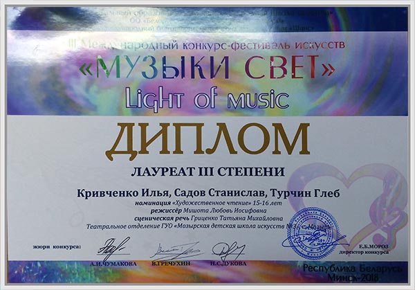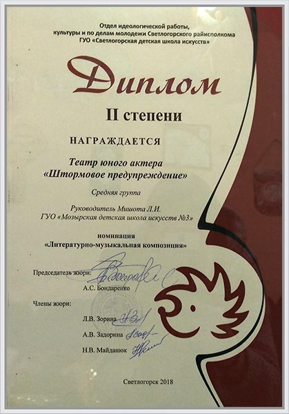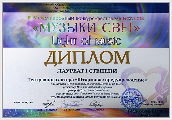 Детский театральный коллектив «Театр юного актера «Штормовое предупреждение» ГУО «Мозырская ДШИ N3» стал лауреатом I, II, III степени Международного конкурса-фестиваля искусств «Музыки свет». Фестиваль проходил в г. Минске 3 марта, организаторам которого является Музыкально образовательный центр «Эстрадная школа талантов». Коллектив принял участие в номинациях «Театральная миниатюра», «Драматический спектакль», «Художественное чтение» и получил хорошие отзывы от членов жюри и не оставил равнодушными зрителей. Педагоги коллектива получили дипломы за профессиональную подготовку лауреата.