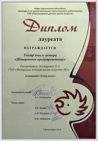 ♦Театр юного актера «Штормовое предупреждение» (номинация «Театр моды») – диплом лауреата, руководитель Нестерович О.А.