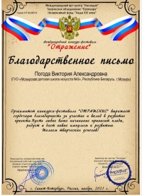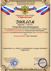 Не только ученики нашей школы, но и педагоги принимают участие в различных конкурсах. Поздравляем педагога по классу фортепиано, ПОГОДУ Викторию АЛЕСАНДРОВНУ, с успешным выступлением в международном конкурсе-фестивале «ОТРАЖЕНИЕ» в номинации «Инструментальное исполнительство», а также с получением ДИПЛОМА ЛАУРЕАТА III СТЕПЕНИ