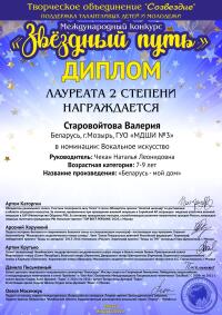Поздравляем СТАРОВОЙТОВУ ВАЛЕРИЮ и её педагога, Чекан Наталью Леонидовну, с успешным выступлением на международном конкурсе «Звездный путь», а также с получением Диплома Лауреата 2 степени.