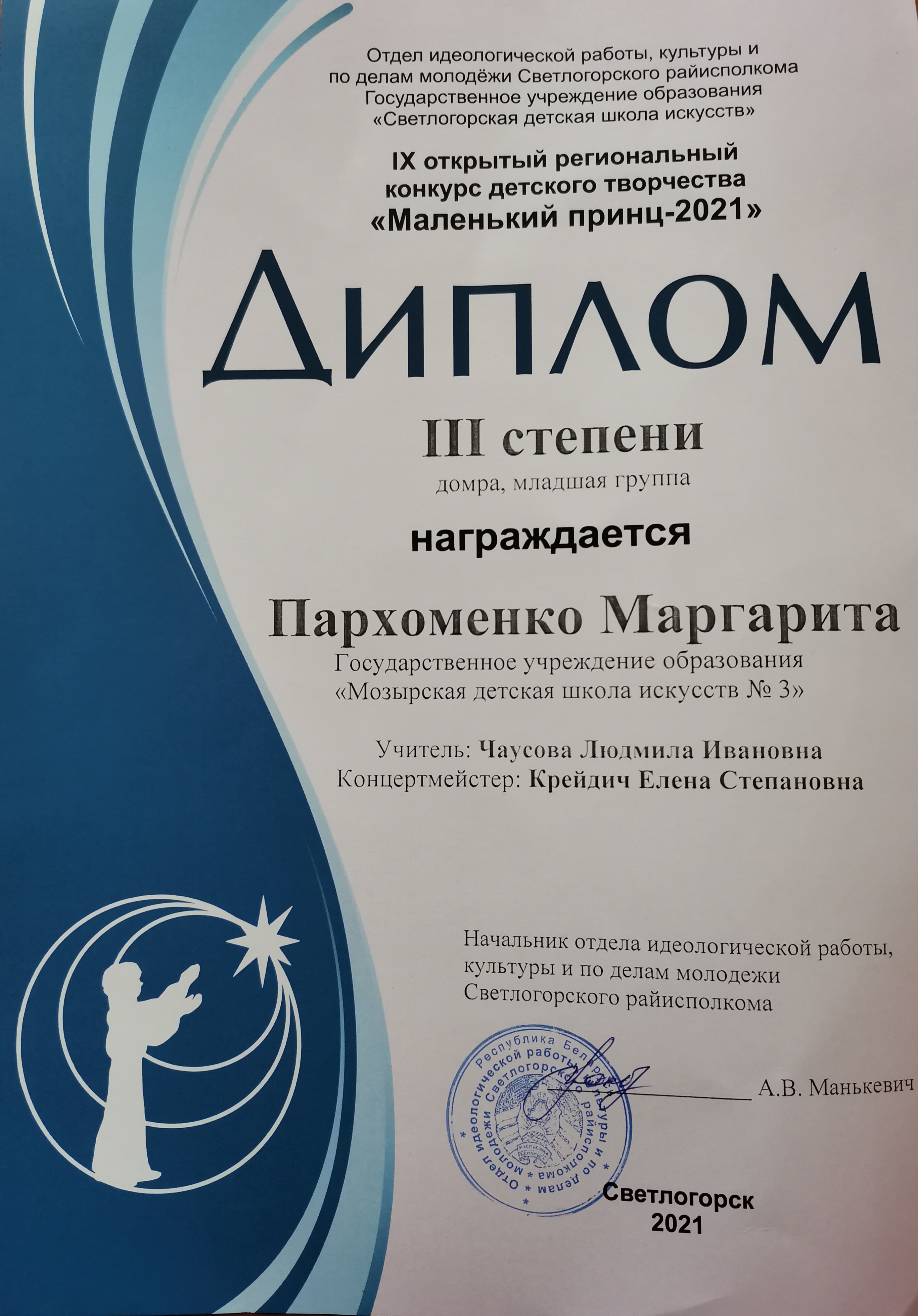 Поздравляем нашу ученицу, Пархоменко Маргариту, а также педагога Чаусову Л. И. концертмейстера Крейдич Е. С с успешным выступлением на конкурсе «Маленький принц 2021″, а также с получением Диплома III степени