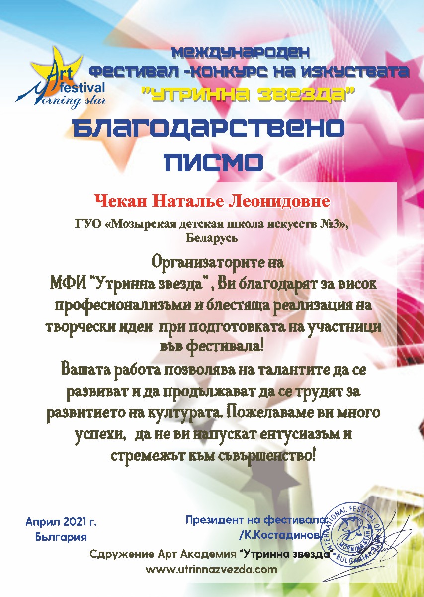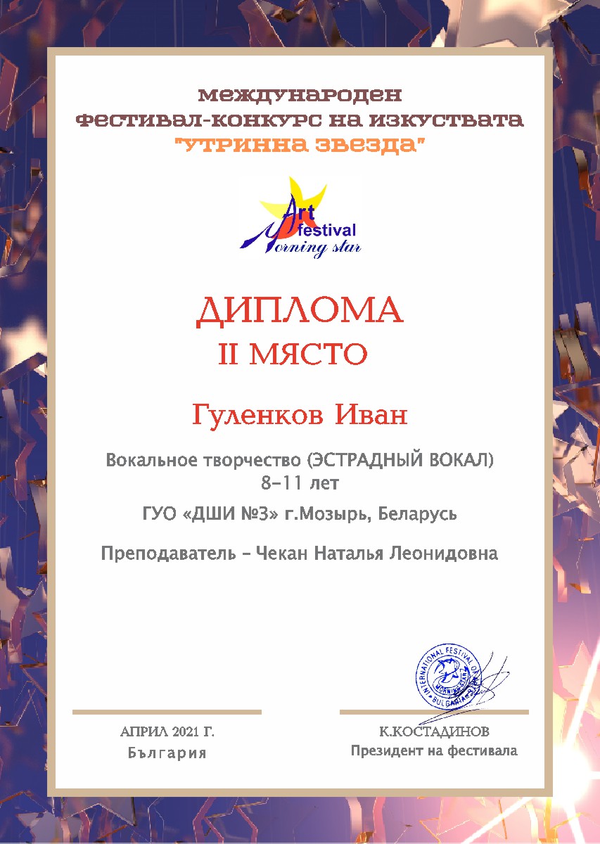 Спешим поздравить нашего ученика, Гуленкова Ивана, а также его педагога, Чекан Наталью Леонидовну, с победой в международных фестивалях — конкурсах «Арт Единство» и «Утренняя звезда»,а также с получением Диплома II степени, и с присвоение звания Лауреат!Дальнейших успехов Ване и его педагогу!
