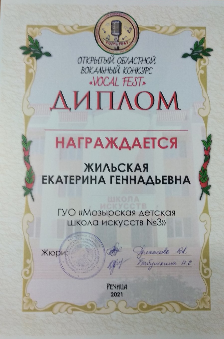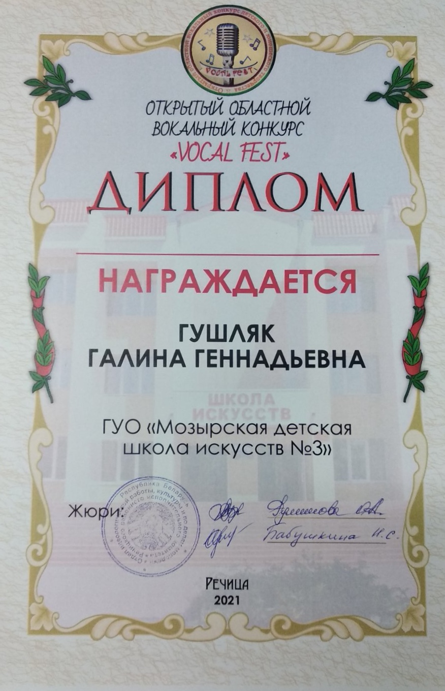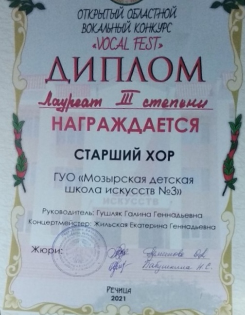 Поздравляем хоровой коллектив старших классов, а также его руководителя Гушляк Г. Г. и концертмейстера Жильскую Е. Г. с успешным выступлением на открытом областном вокальном конкурсе «Vocal Fest» в г. Речица, с получением Диплома III степени, с присвоением звания «Лауреат»!