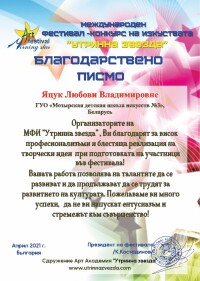 Ученики фортепианного отделения (н.п.Рудня) Яскевич Алеся и Попова Маргарита (уч. Яцук Л. В.) завоевали Дипломы Лауреатов I степени сразу на 2х международных конкурсах: «Арт-Единство» и «Утренняя Звезда» !!! Любовь Владимировна была отмечена благодарностью за профессиональную поддержку и работу над мастерством учеников.