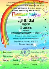 Хоровой коллектив старших классов — ДИПЛОМ ЛАУРЕАТА II степени, учитель Гушляк Г. Г., концертмейстер Жильская Е. Г.