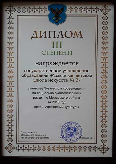 По итогам соревнования среди учреждений культуры Mозырская детская школа искусств №3 была награждена дипломом III степени.