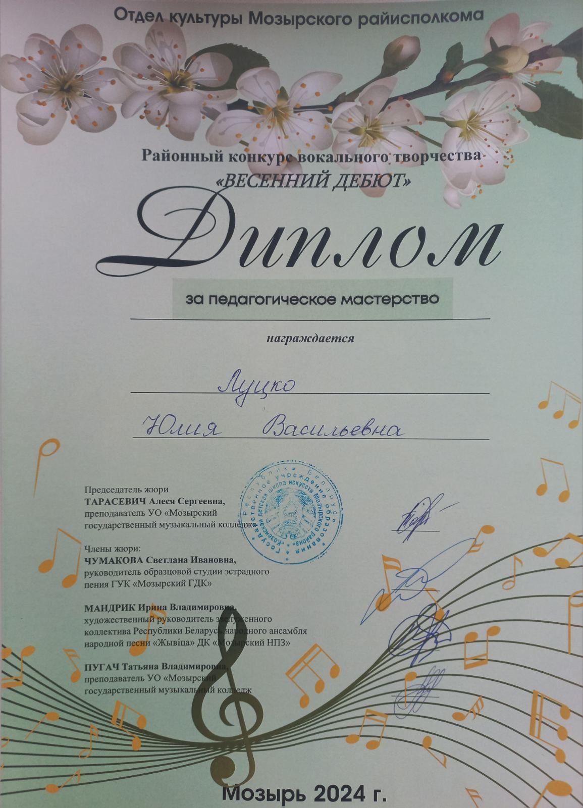 Учитель ЛУЦКО ЮЛИЯ ВАСИЛЬЕВНА награждена дипломом за педагогическое мастерство