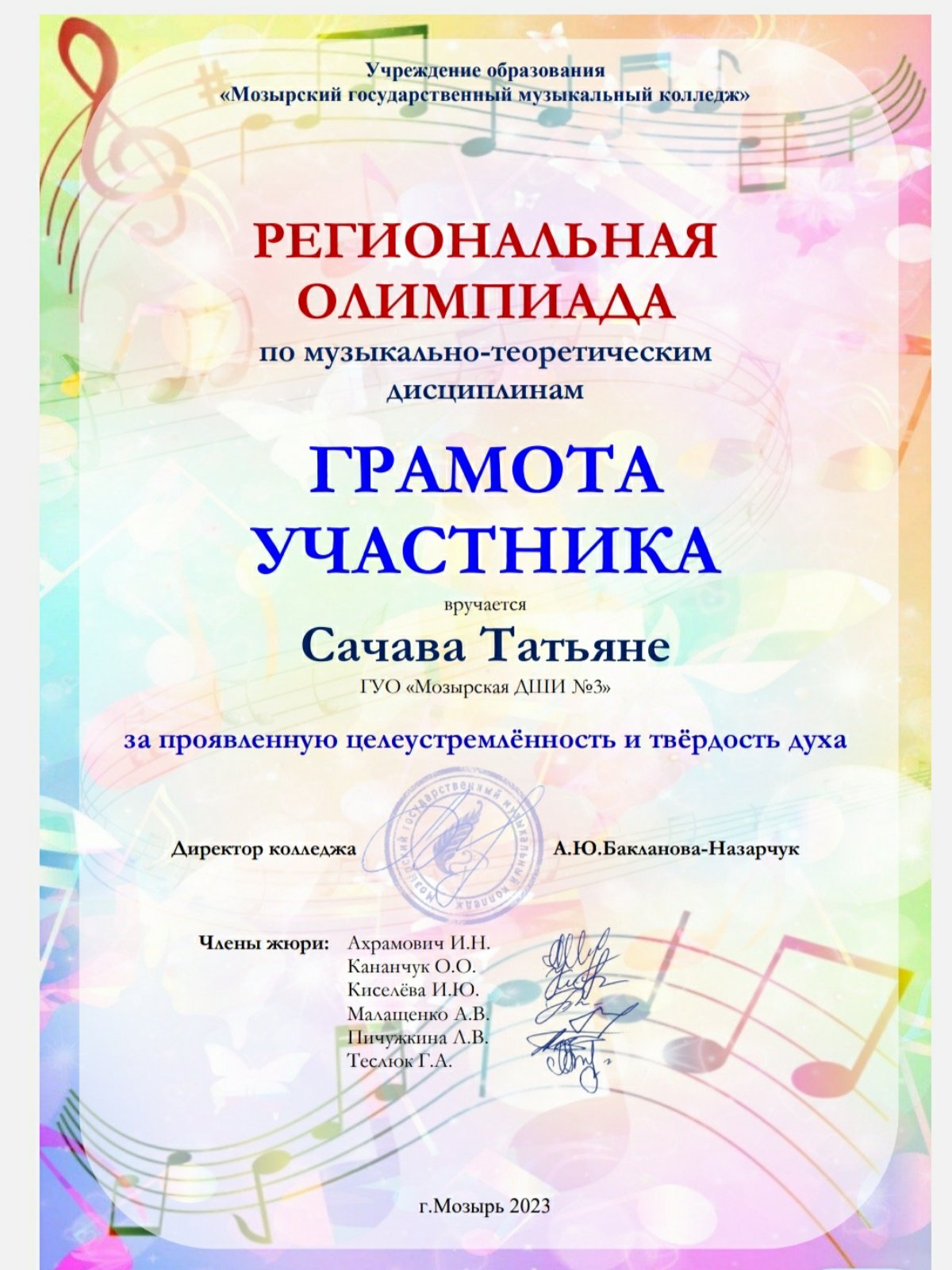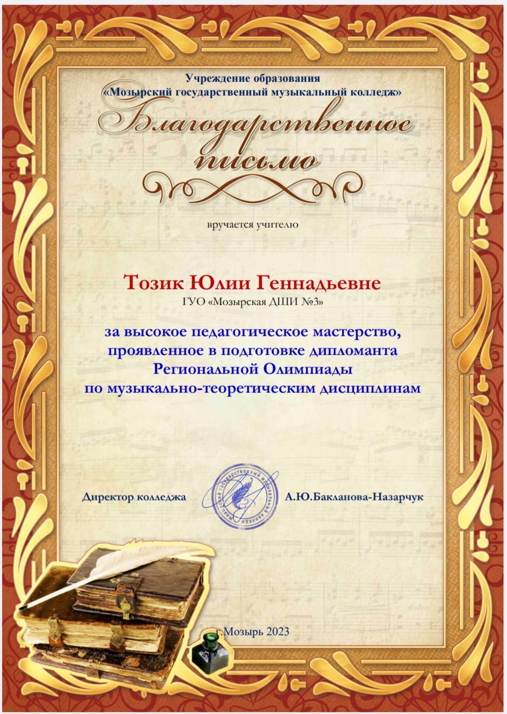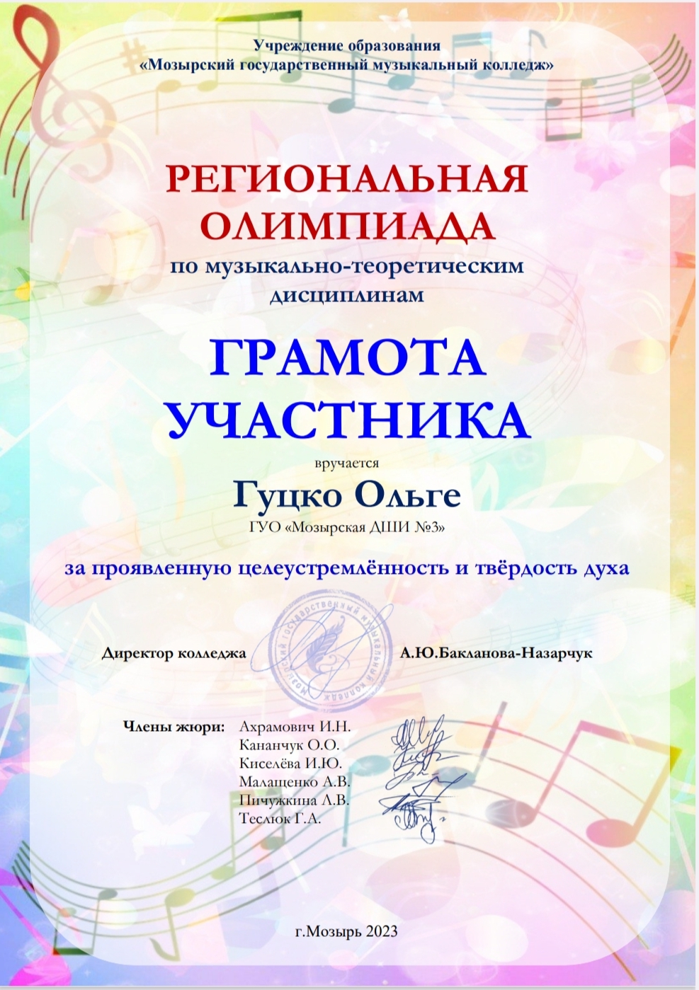 01.03.2023 в ГУО»Мозырском государственном музыкальном колледже» прошла региональная олимпиада по музыкально-теоретическим дисциплинам✨Благодарственное письмо получила ТОЗИК Юлия Геннадьевна за высокое педагогическое мастерство ✨Также ГРАМОТЫ получили учащиеся ГУЦКО Ольга, АКУНЕЦ Мария и САЧАВА Татьяна