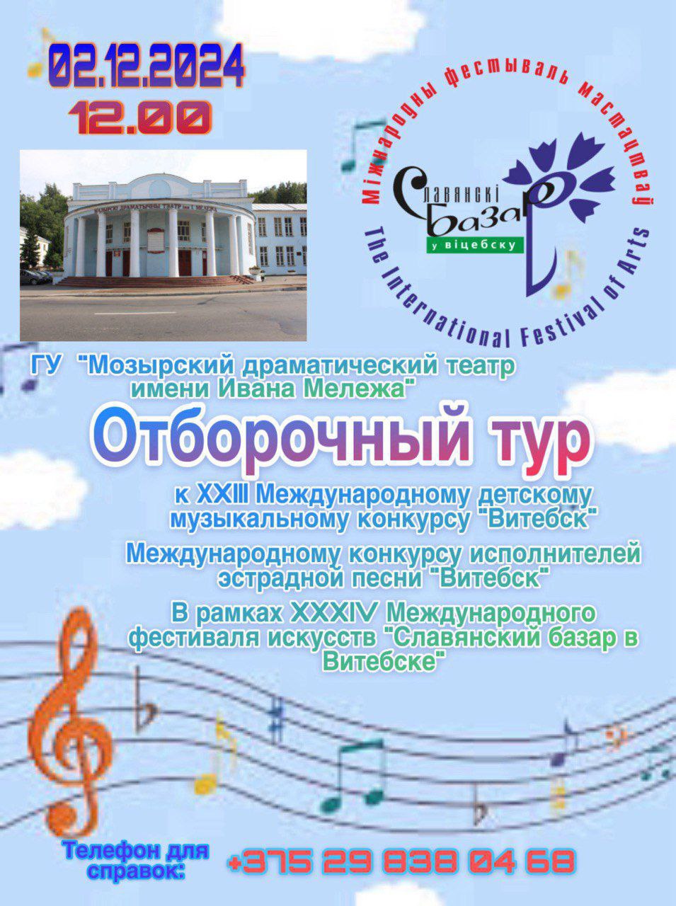 2 декабря 2024 года в ГУ «Мозырский драматический театр имени Ивана Мележа» пройдут отборочные туры к ХXIII Международному детскому музыкальному конкурсу «Витебск», и XXXIV Международному конкурсу исполнителей эстрадной песни «Витебск», в рамках XXXIV Международного фестиваля искусств «Славянский базар в Витебске».