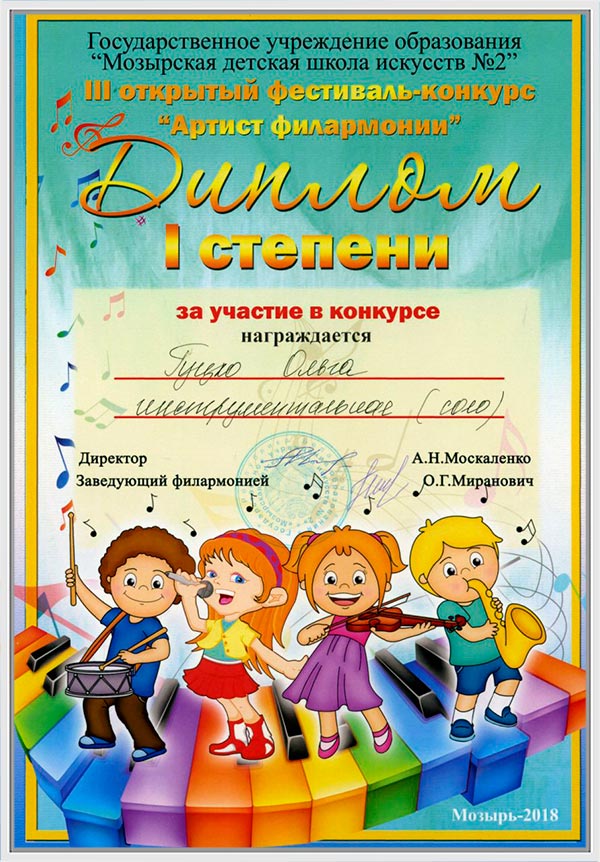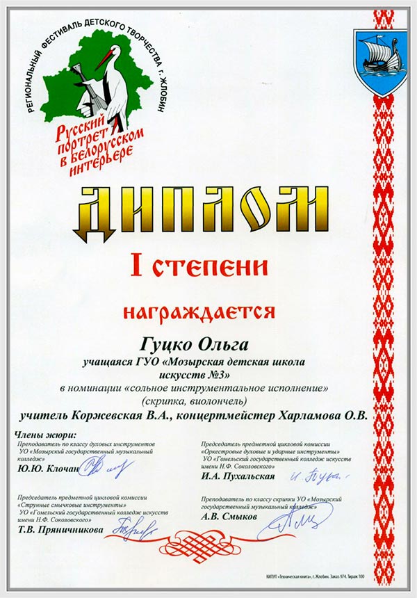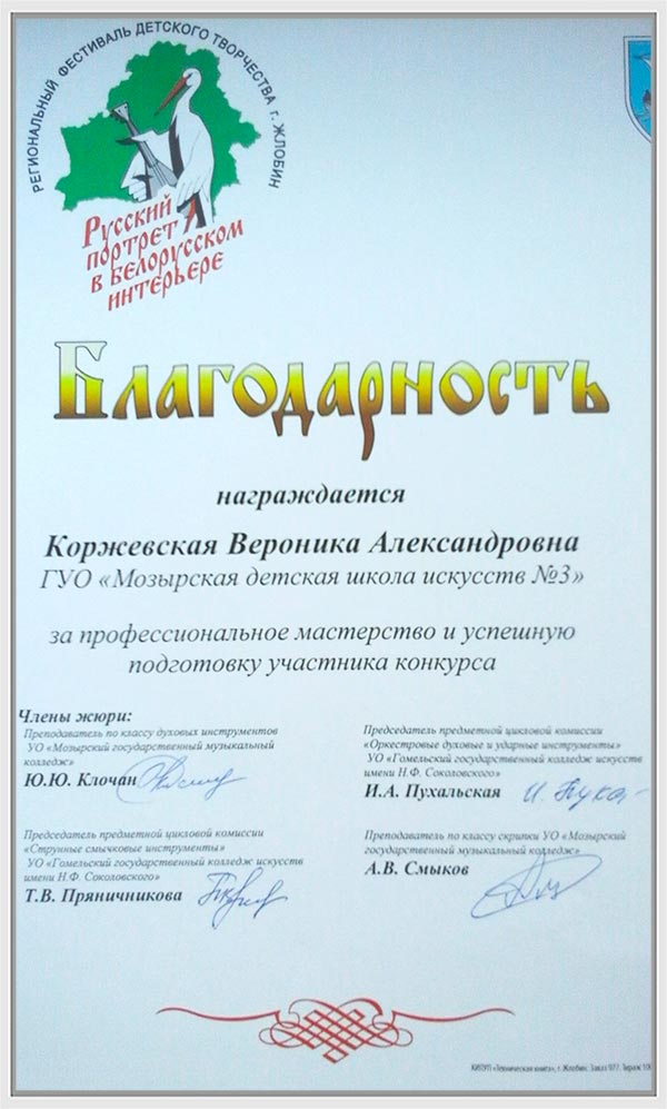 29 марта 2018 на IX региональном фестивале детского творчества в г.Жлобине «Русский портрет в белорусском интерьере», — Диплом I степени, а учителю Коржевской В.А. вручена благодарность за профессиональное мастерство и успешную подготовку участника конкурса.