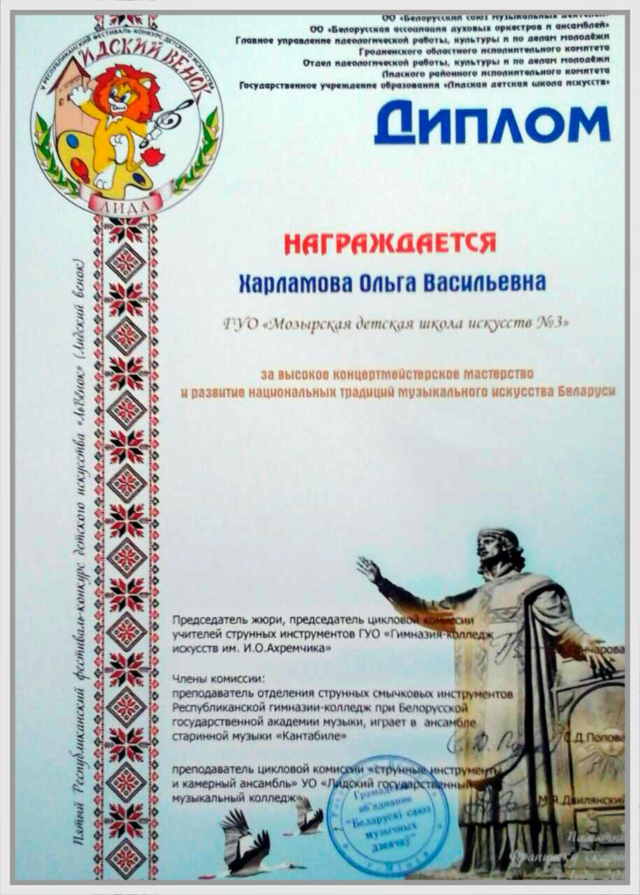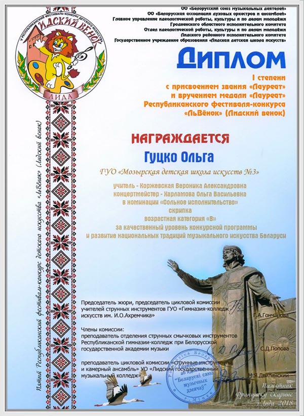 12 мая 2018 на V республиканском фестивале-конкурсе детского искусства «Львенок» (Лидский венок), в Лиде (Гродненская обл.), — Диплом I степени с присвоением звания «Лауреат» и вручением медали «Лауреат». Учителю и бессменному концертмейстеру (Харламовой Ольге Васильевне) вручены дипломы за развитие национальных традиций музыкального искусства Беларуси и высокое педагогическое и концертмейстерское мастерство соответственно.