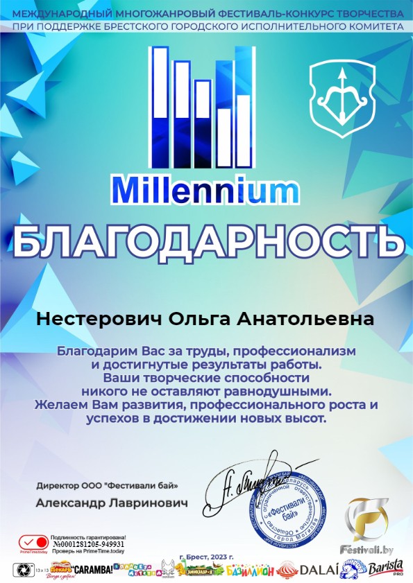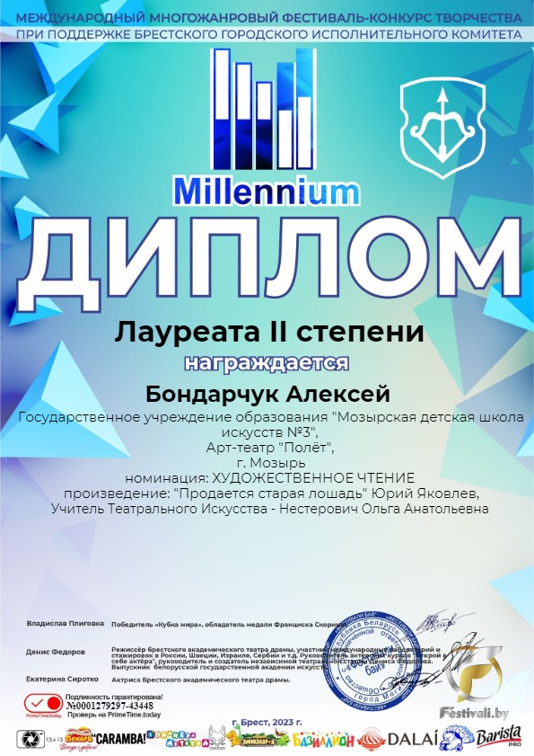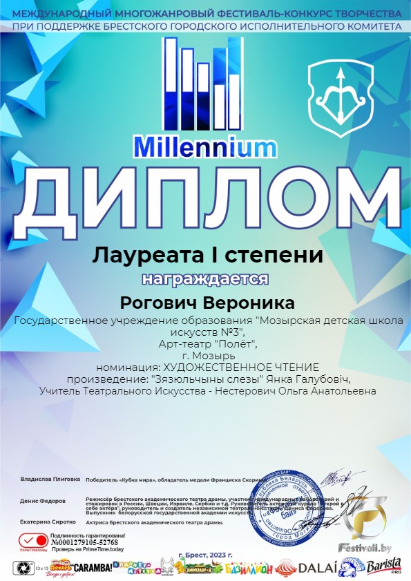 Учащиеся театрального отделения класса Ольги Анатольевны Нестерович приняли участие в Международном многожанровом фестивале-конкурсе творчества при поддержке Брестского городского исполнительного комитета «Millennium”. В номинации «Художественное чтение» каждый ученик был отмечен дипломом Лауреата! Поздравляем победителей
