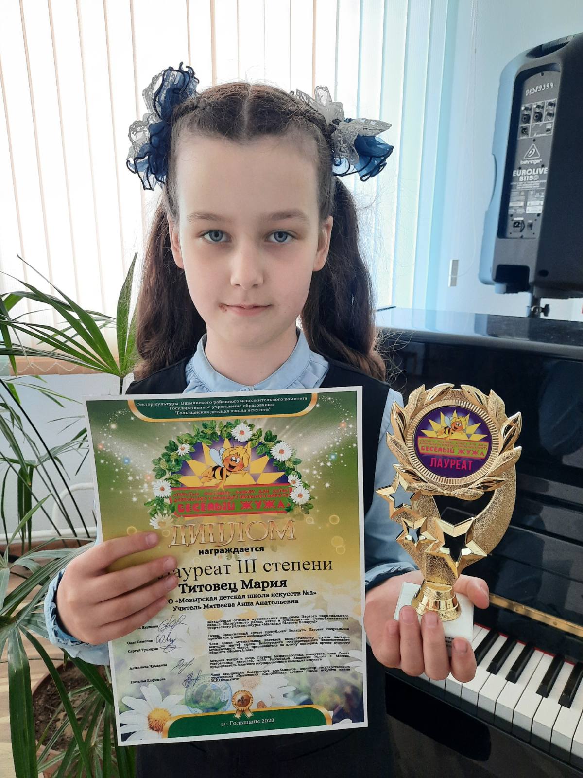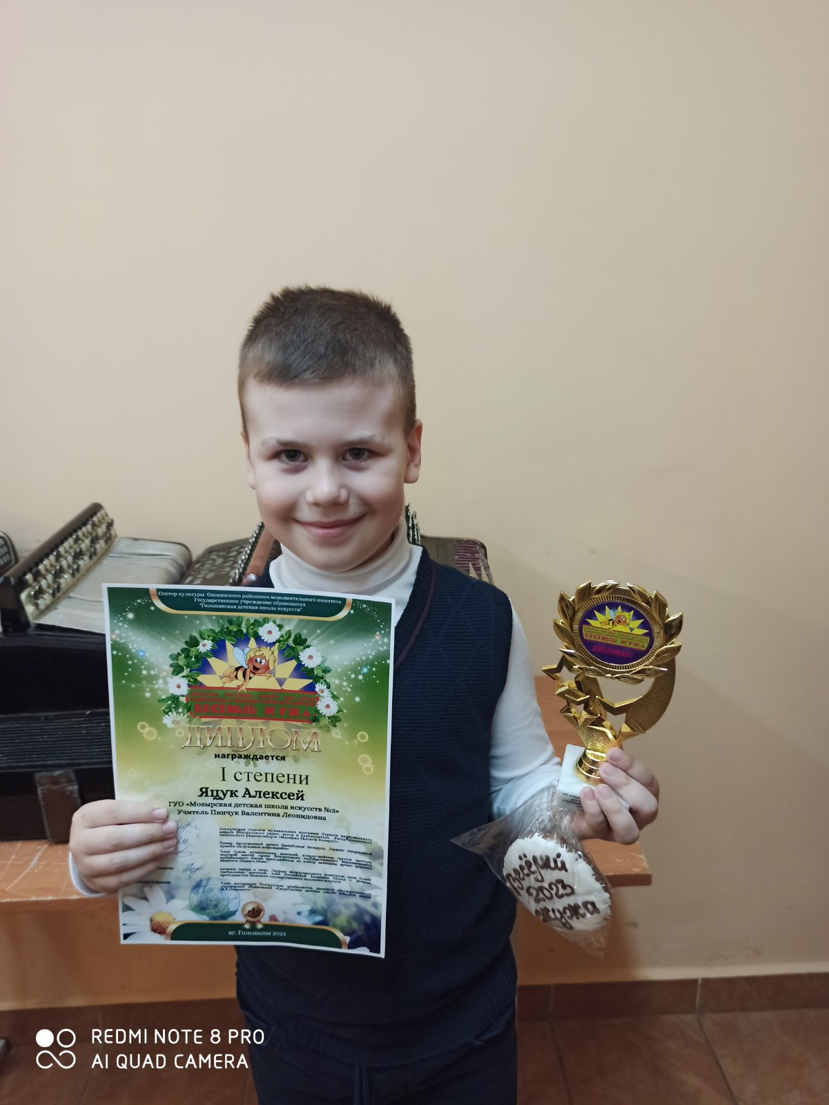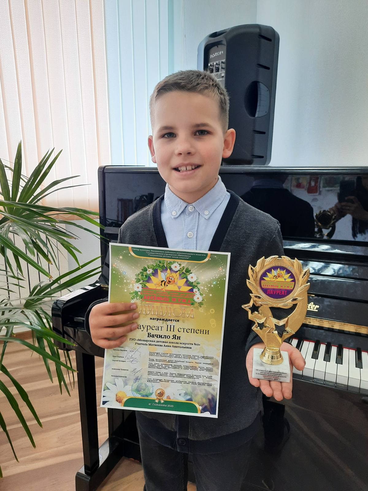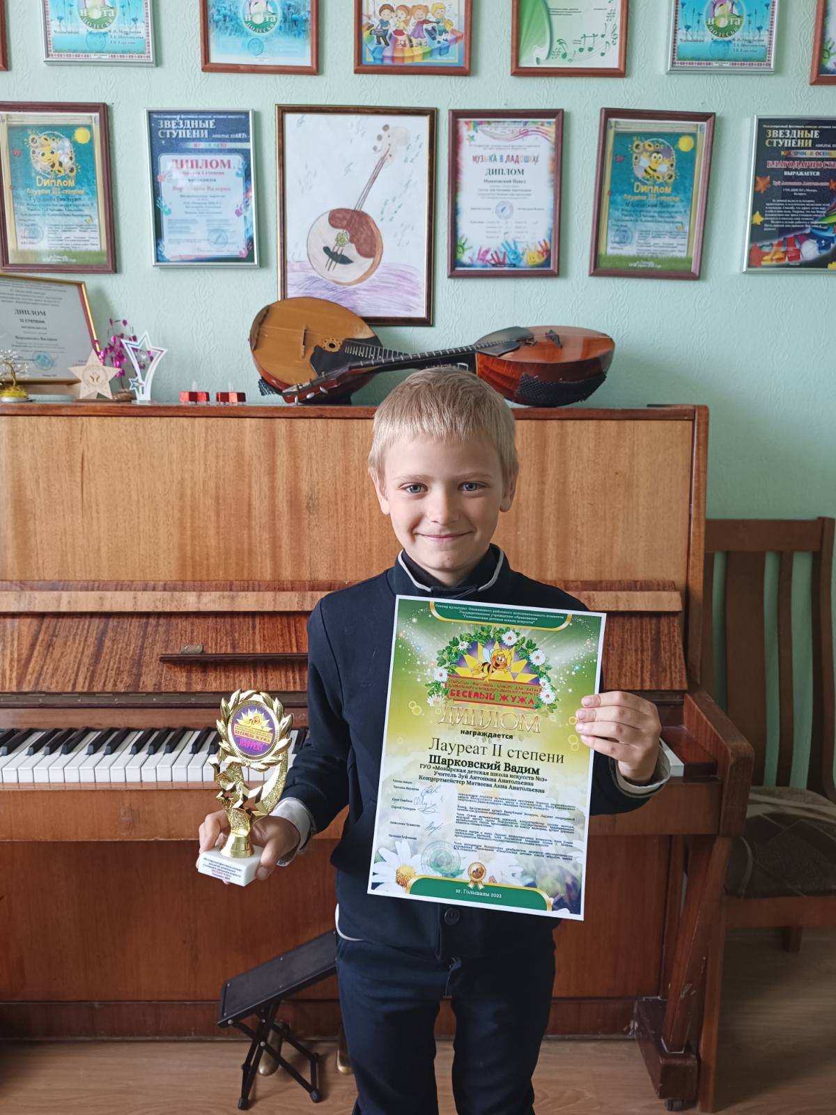 Открытый фестиваль-конкурс для детей дошкольного и младшего школьного возраста «Весёлый Жужа»✨ Лауреат II степени Шарковский Вадим Учитель ЗУЙ Антонина Анатольевна Концертмейстер МАТВЕЕВА Анна Анатольевна Лауреаты II степени Болтик Яков и Болтик Павел Учитель ЯЦУК Любовь Владимировна Лауреат III степени Бачило Ян Учитель МАТВЕЕВА Анна Анатольевна Лауреат III степени Титовец Мария Учитель МАТВЕЕВА Анна Анатольевна Дипломант I степени Яцук Алексей Учитель ПИНЧУК Вадим Михайлович Лауреат III степени Полторан София Учитель ЯЦУК Любовь Владимировна ПОЗДРАВЛЯЕМ✨