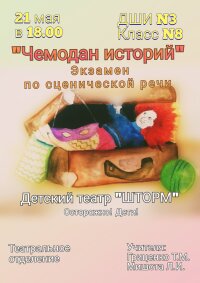 Близится к концу учебный год! А у юных артистов театрального отделения детского театра «ШТОРМ» Осторожно! Дети! — все только начинается. Долгожданные премьеры и показы. Этот год был очень насыщенный на события, многое реализовали, многое предстоит реализовать. Но главное в том, что стоит за этими событиями и достижениями: это путь, это огромный труд каждого ребенка и учителя. Это познание нового и открытие себя нового! Благодарим всех и каждого за доверие, за терпение, за веру в театральное искусство. И приглашаем всех на наши показы. Следите за информацией. А начнем мы 21 мая – Экзамен по основам сценической речи «Чемодан историй». Начало 18-00. В 8 классе ДШИ. Работа учителей Гриценко Т.М. и Мишота Л.И.