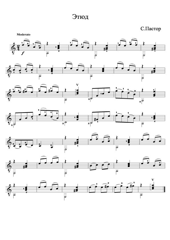 Примечание. Этюд яркий и темпераментный, пронизан испанскими интонациями, поскольку написан испанским гитаристом Секундо Пастором. Тональность ля минор. Основной приём легато. Этюд не только красив, но и весьма полезен, так как в нем есть и восходящее (такты 1 — 15), и нисходящее легато (такты 28-42).
