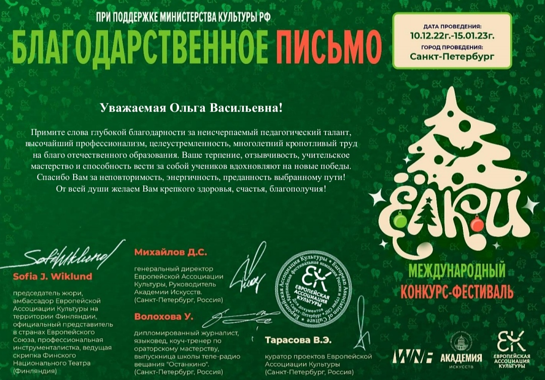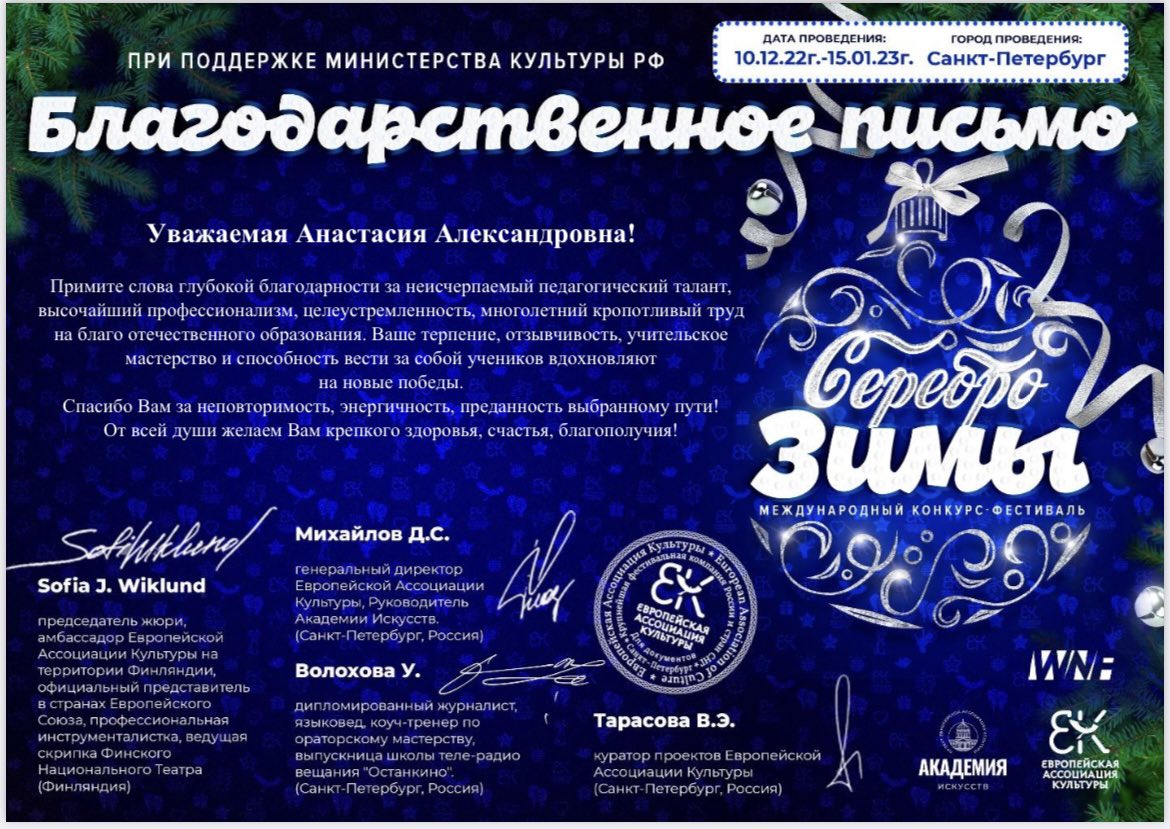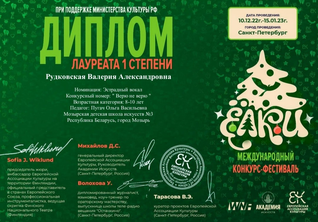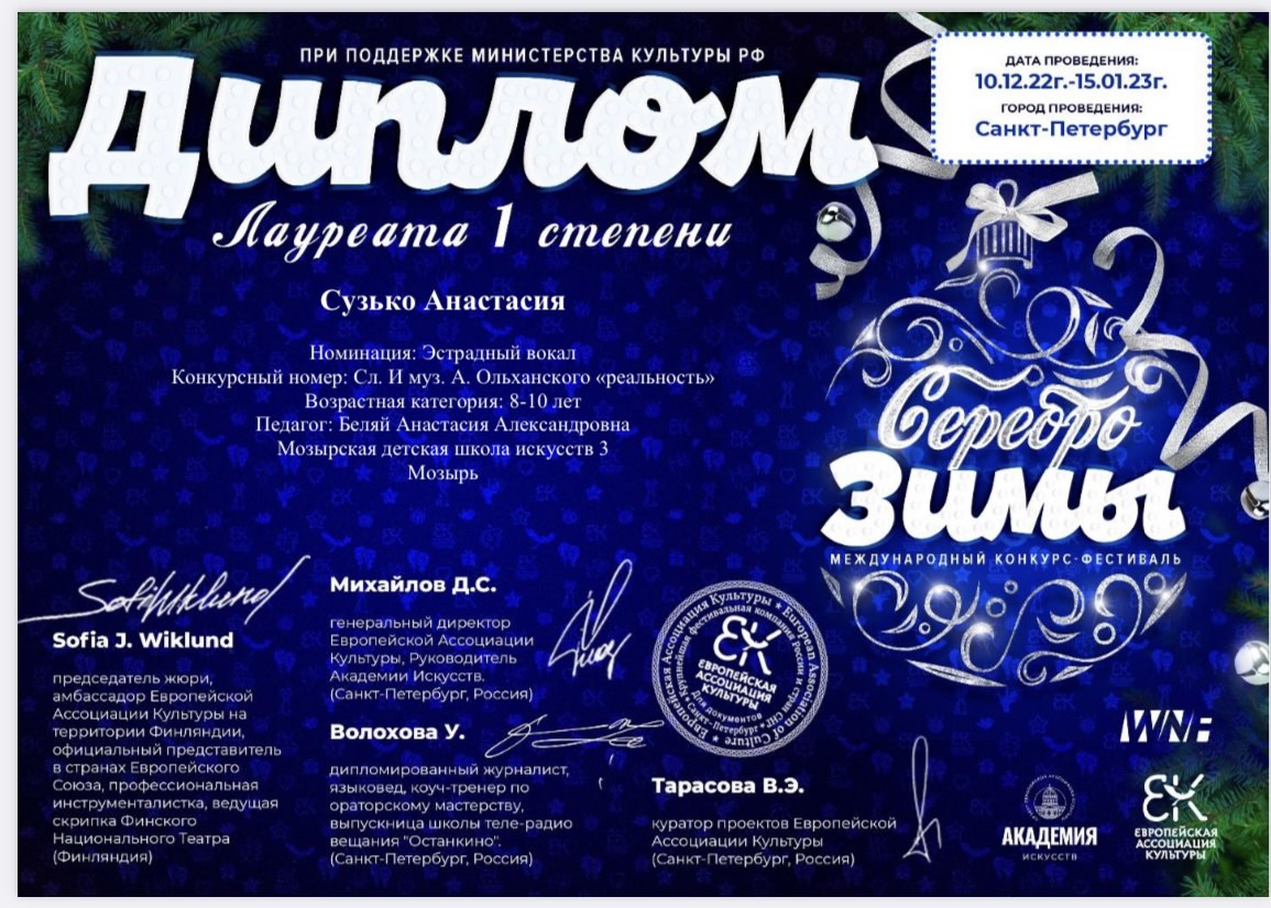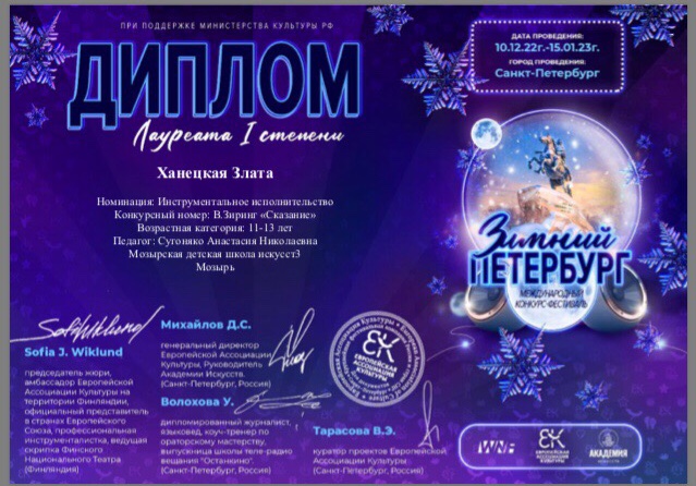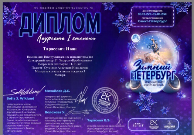 ПОЗДРАВЛЯЕМ Диплом ЛАУРЕАТА I СТЕПЕНИ ТАРАСЕВИЧ ИВАН и ХАНЕЦКАЯ ЗЛАТАМеждународный конкурс-фестиваль «ЗИМНИЙ ПЕТЕРБУРГ»✨учитель: СУГОНЯКО Анастасия Николаевна✨