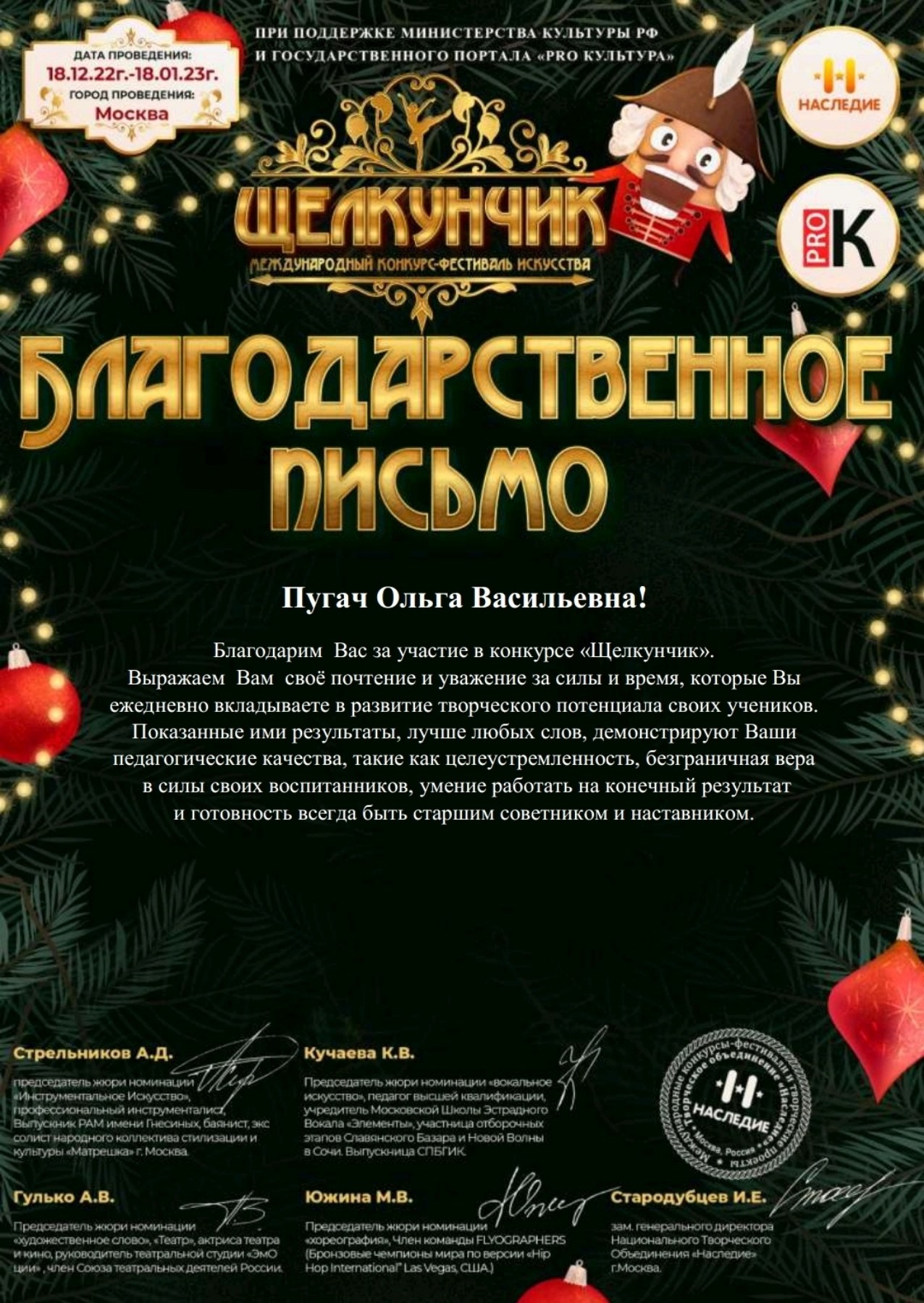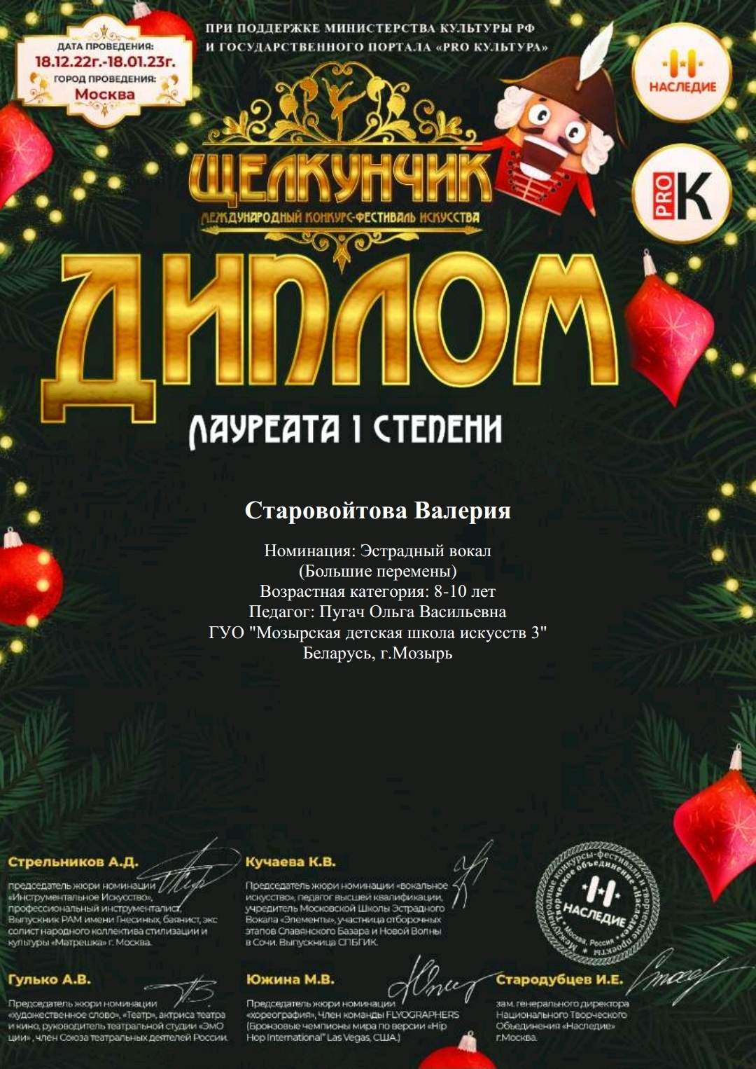 ПОЗДРАВЛЯЕМ Диплом ЛАУРЕАТА I СТЕПЕНИ СТАРОВОЙТОВА ВАЛЕРИЯ Международный конкурс-фестиваль искусства «ЩЕЛКУНЧИК»✨учитель: ПУГАЧ Ольга Васильевна✨