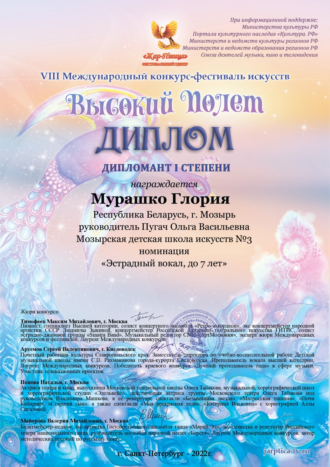 ПОЗДРАВЛЯЕМ Дипломант I СТЕПЕНИ МУРАШКО ГЛОРИЯ VIII Международный конкурс-фестиваль искусств «ВЫСОКИЙ ПОЛЕТ»✨ учитель: ПУГАЧ Ольга Васильевна✨