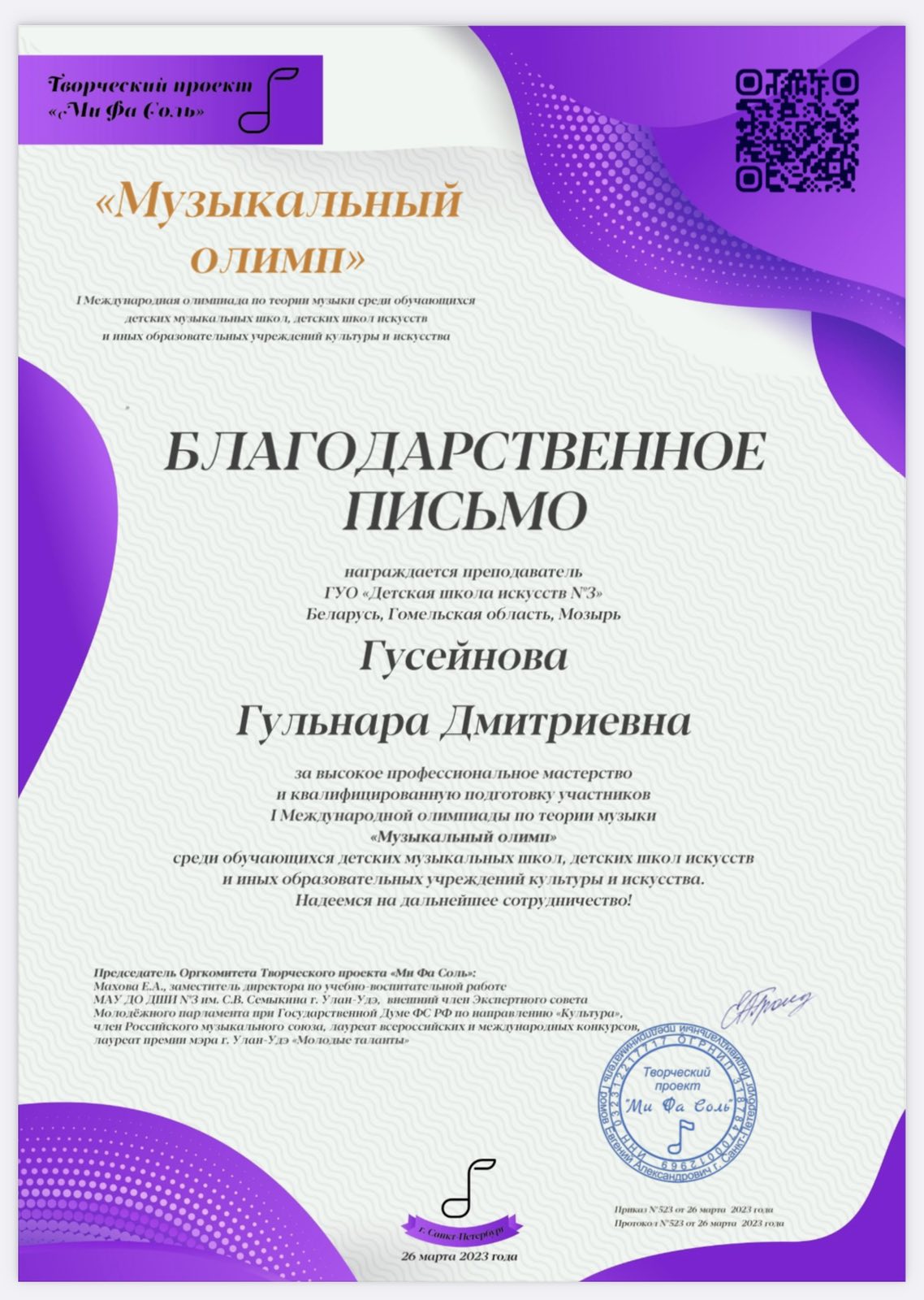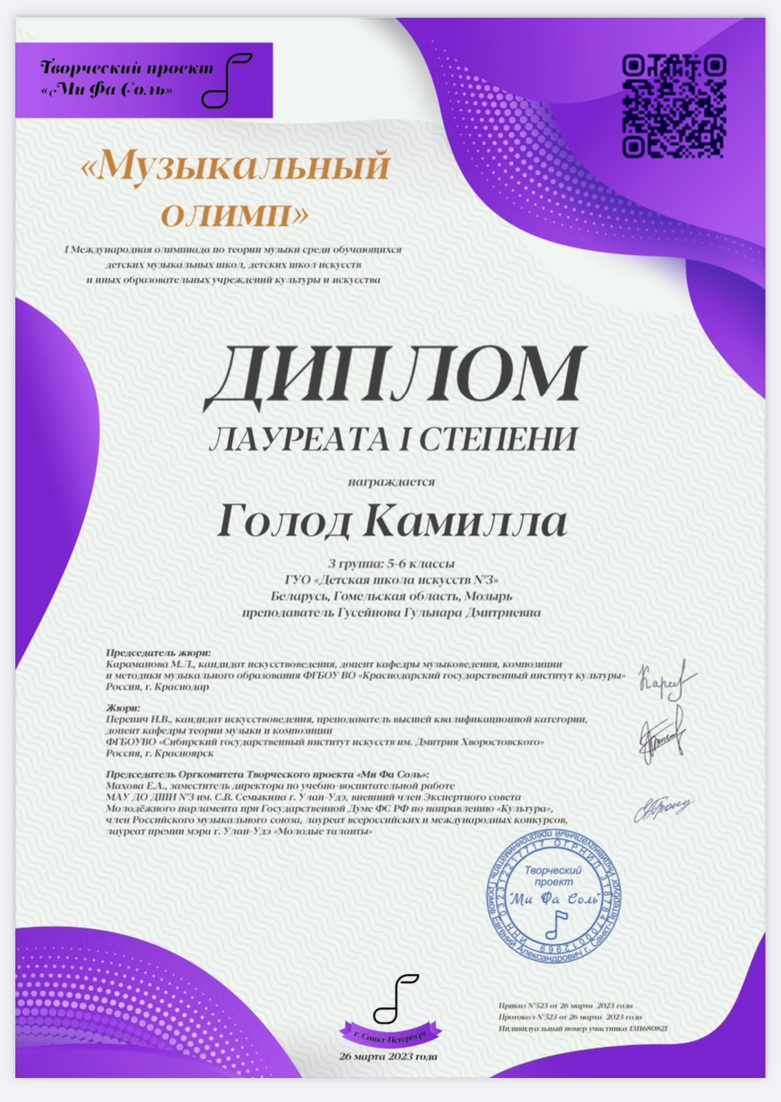 ПОЗДРАВЛЯЕМ ДИПЛОМ ЛАУРЕАТА I СТЕПЕНИ✨ I Международная олимпиада по теории музыки «МУЗЫКАЛЬНЫЙ ОЛИМП»✨ ГОЛОД Камилла✨учитель ГУСЕЙНОВА Гульнара Дмитриевна✨