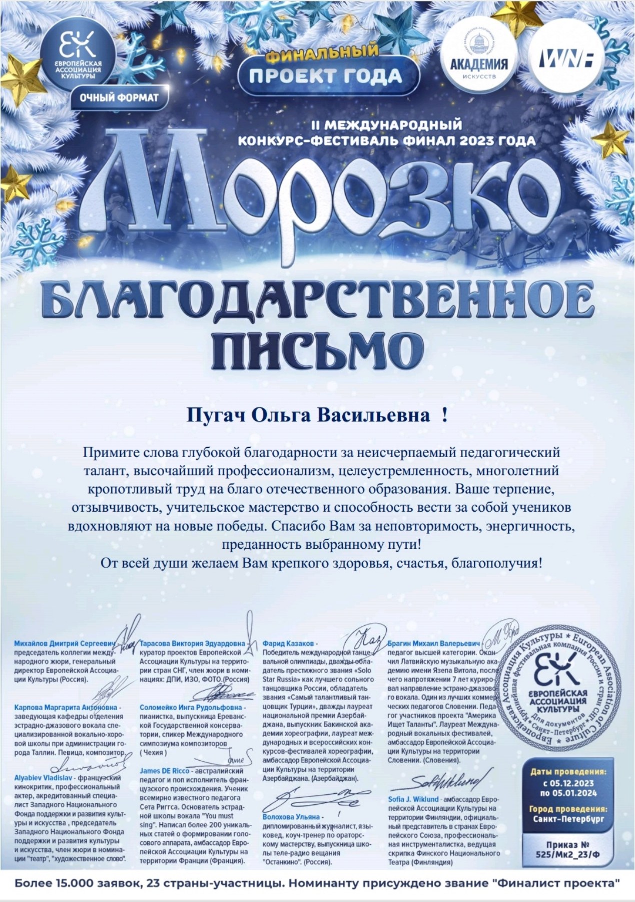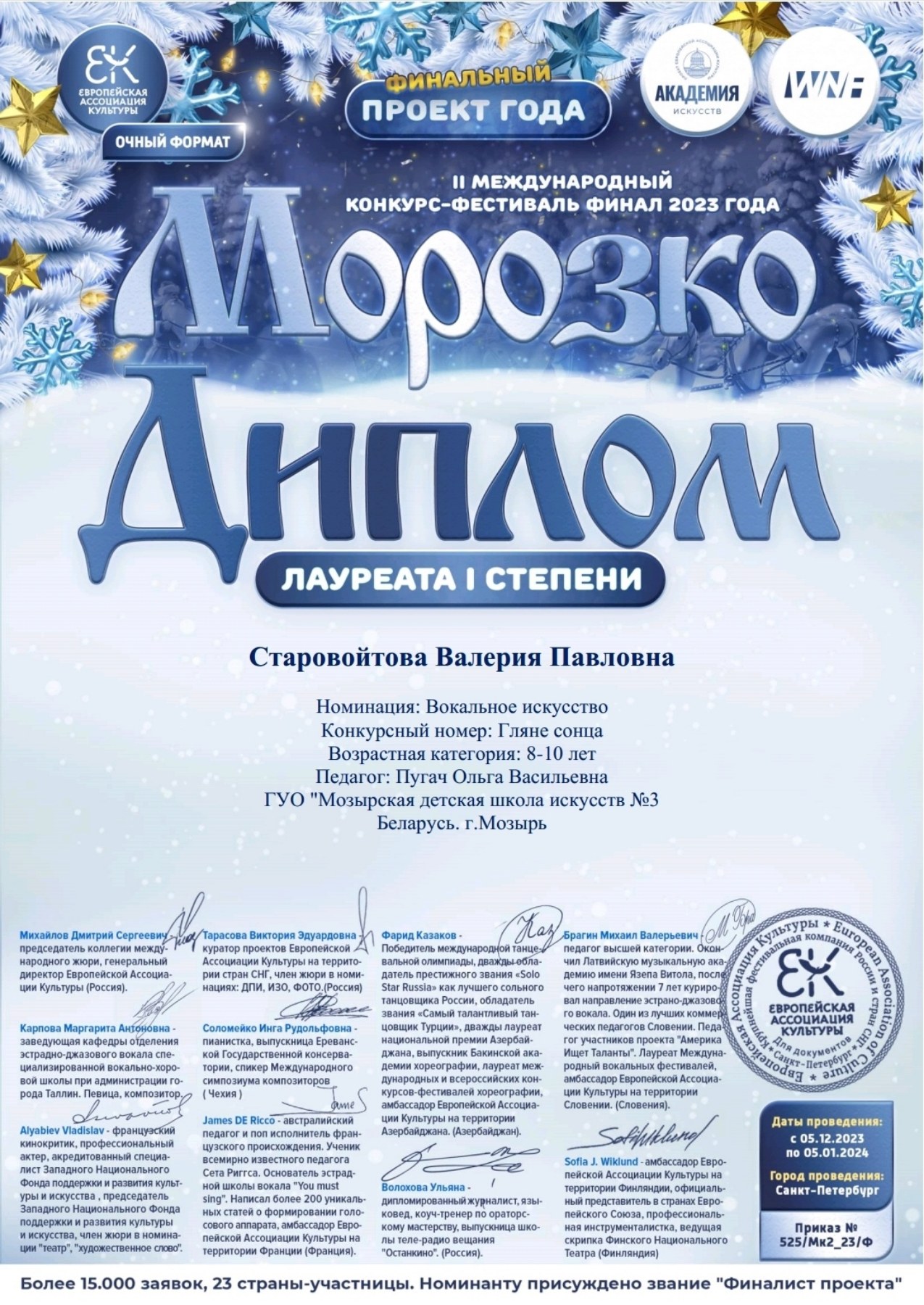 Главная >> Достижения >> II МЕЖДУНАРОДНЫЙ КОНКУРС-ФЕСТИВАЛЬ ФИНАЛ 2023 "МОРОЗКО"