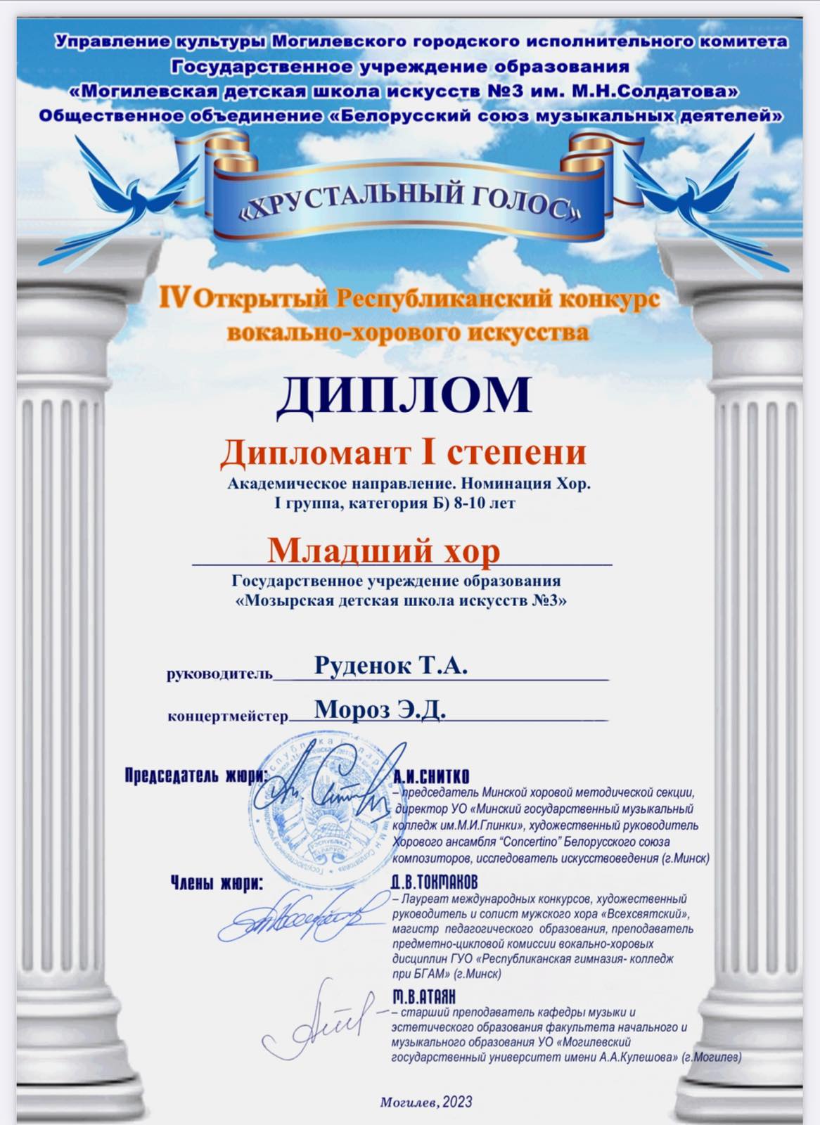 Дипломант I степени МЛАДШИЙ ХОР учитель:РУДЕНОК Татьяна Алексеевна концертмейстер:МОРОЗ Эллина Дмитриевна
