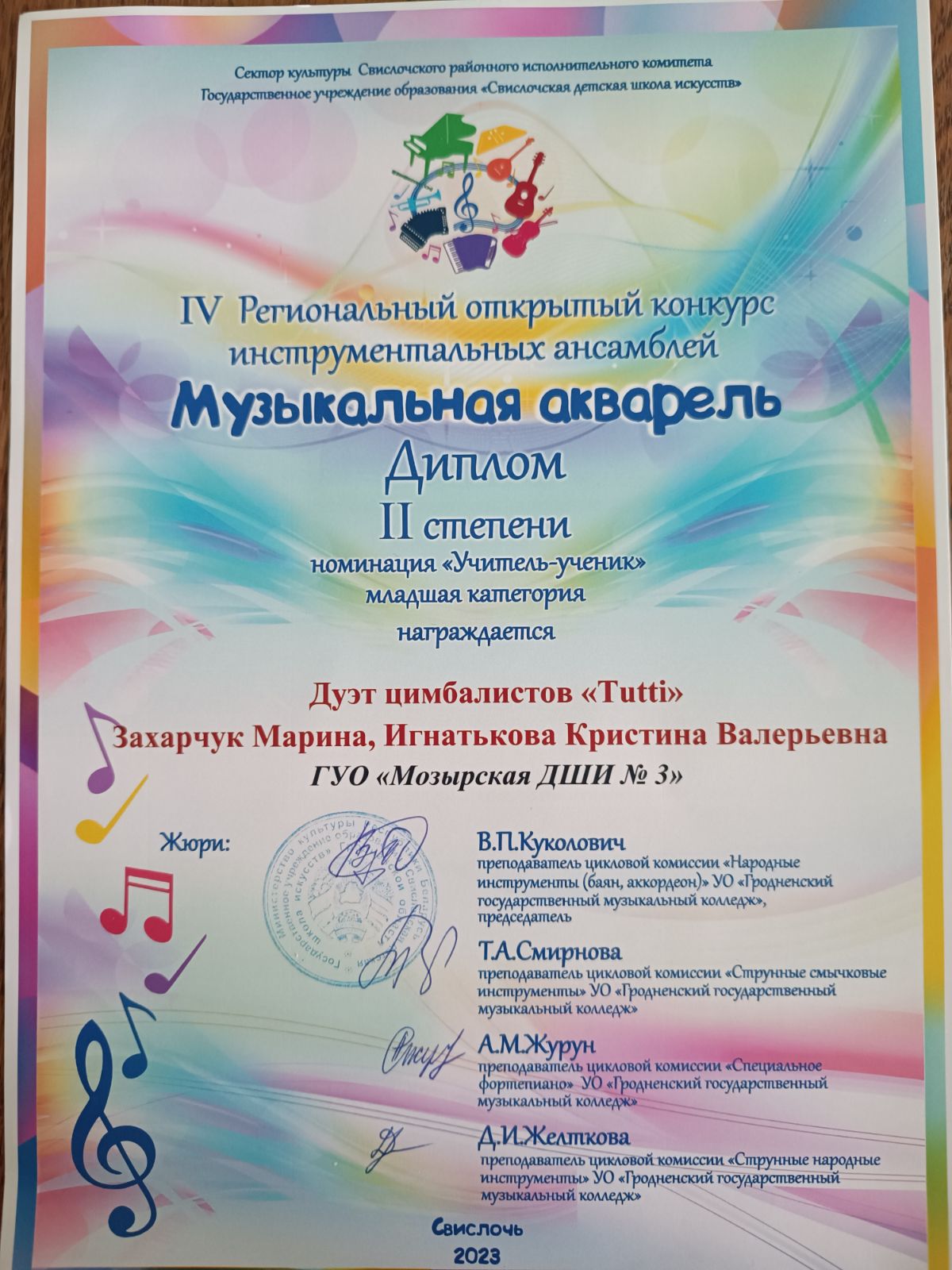 IV РЕГИОНАЛЬНЫЙ ОТКРЫТЫЙ КОНКУРС ИНСТРУМЕНТАЛЬНЫХ АНСАМБЛЕЙ ДИПЛОМ ЛАУРЕАТА III степени Болтик Павел,Болтик Яков учитель: ЯЦУК Любовь Владимировна ГРАМОТА за высокое педагогическое мастерство ЯЦУК Любовь Владимировна ДИПЛОМ II степени Ансамбль «Странники» Машковский Павел учитель:Зуй Антонина Анатольевна концертмейстер: Матвеева Анна Анатольевна ДИПЛОМ II степени Дуэт цимбалистов «Tutti» Захарчук Марина учитель:Игнатькова Кристина Валерьевна ПОЗДРАВЛЯЕМ ✨