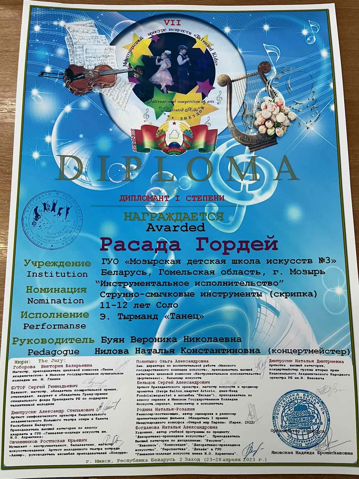 ДИПЛОМАНТ I степениРасада Гордей учитель:БУЯН Вероника Николаевнаконцертмейстер:НИЛОВА Наталья Константиновна